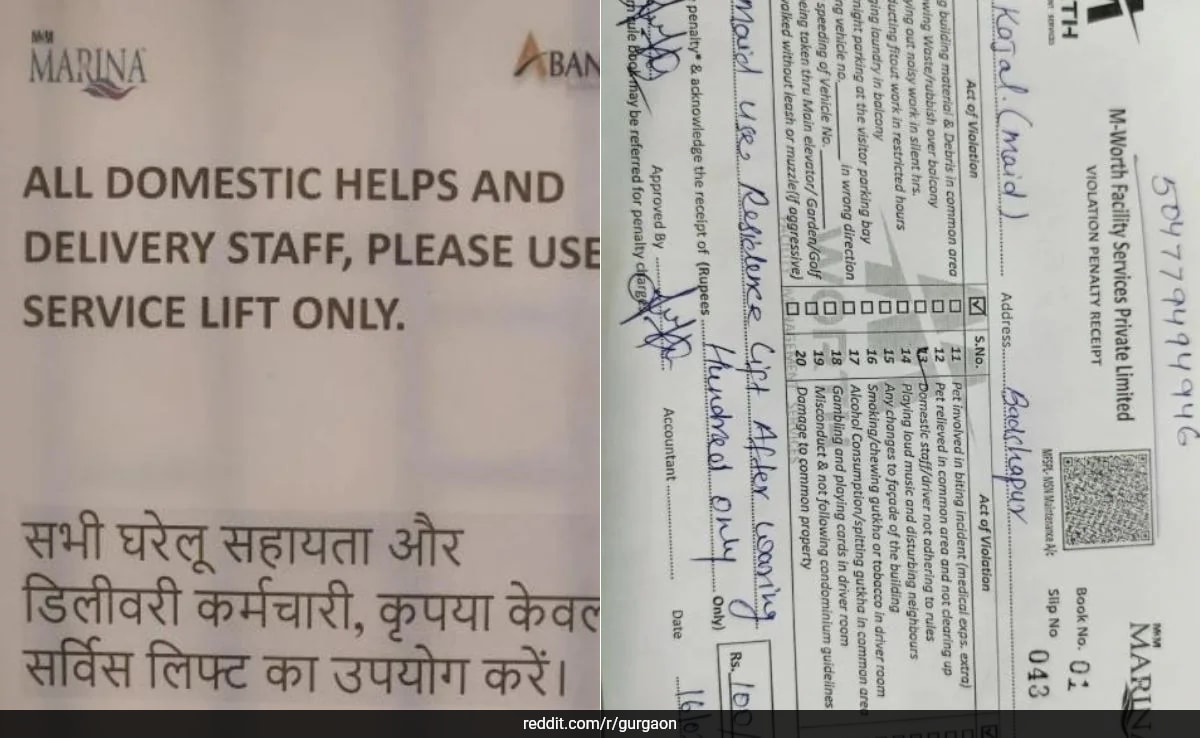 गुरुग्राम हाऊसिंग सोसायटीने सेवा लिफ्टची मुख्य लिफ्ट इन्स्टालॅड घेतल्याबद्दल घरगुती मदतनीस आणि वितरण कर्मचार्यांना दंड आकारला. रेडडिट वापरकर्त्याने नोटीस आणि फिन स्लिप्सच्या प्रतिमा पोस्ट केल्यानंतर ही समस्या उघडकीस आली, ज्याने ऑनलाइन बरेच बझ तयार केले.