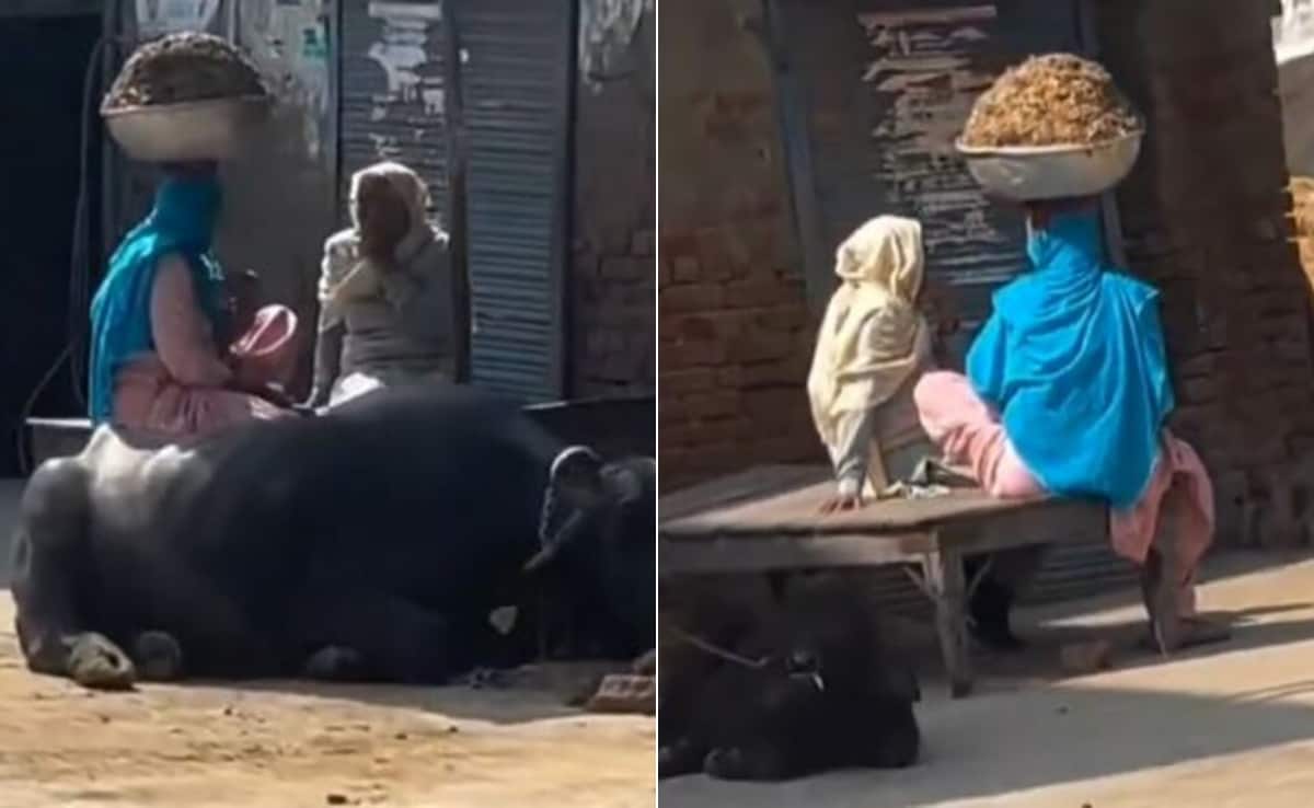व्हायरल व्हिडिओमध्ये, आपण पाहू शकता की म्हैस पेगसह बांधलेला आहे आणि दोन स्त्रिया जवळच बसल्या आहेत. या व्हिडिओबद्दलची मनोरंजक गोष्ट अशी आहे की यापैकी एका महिलेने तिच्या डोक्यावर एक मोठा लोखंडी भांडे आहे, ज्यामध्ये बरीच गायी शेण भरली आहे. परंतु आपण पाहता की वृद्ध स्त्री तिच्या डोक्यावर खूप ओझे असूनही बसून आरामात बोलत आहे. त्यांच्याकडे पहात असताना असे दिसते की त्यांना आठवत नाही की त्यांनी त्यांच्या डोक्यावर इतका भारी ओझे ठेवला आहे. अगदी स्त्रीनेही लोखंडी तुळई हाताने धरली नाही आणि ती अचूक संतुलन करून ती कशी बसली आहे आणि आरामात कशी बोलत आहे.